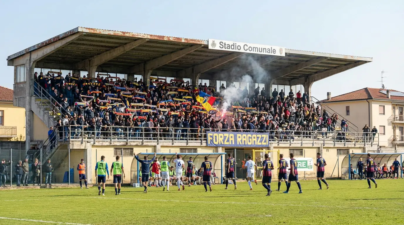 Campo da calcio di Serie B con tribuna coperta e tifosi locali durante il giorno